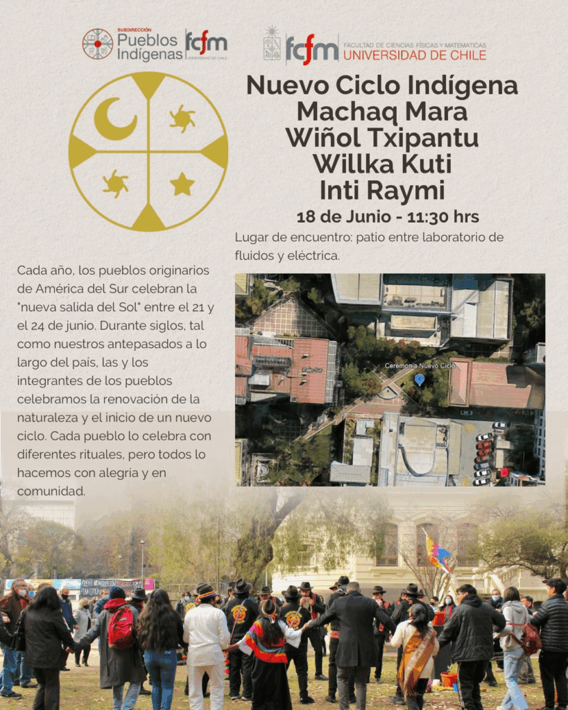 Están cordialmente invitados/as a la celebración del Nuevo Ciclo Indígena acá en Beauchef, el miércoles 18 de junio desde las 11:30 horas en el patio entre el Laboratorio de Fluidos y Electrotecnologías.